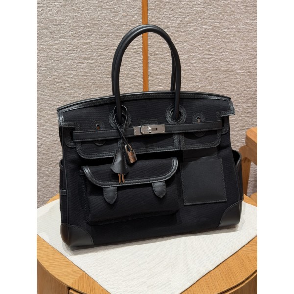 Style:Birkin cargo Colour:89/Noir Size:35*25*18cm Leather:swift and canvas Hardware:silver 버킨백 35 카고, 블랙, 프랑스 수입 순정 소가죽 평직 캔버스, 실버 버클, 고급 수제 맞춤 제작 주문 실사