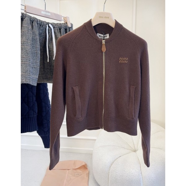 Miu Miu 2026 가을과 겨울 신상 밤색 니트 재킷 가디건 정염사, 캐시미어 혼방, 짧은 집업 디자인 야구 넥+두 개의 포켓으로 실용적이고 스타일리쉬하며 밤색 컬러는 메일라드 계열로 스커트나 청바지와 매치해도 예쁨 소녀스러움과 럭셔리함을 겸비하여 데일리 출퇴근은 물론 캐주얼에도 고급스러운 무드를 연출