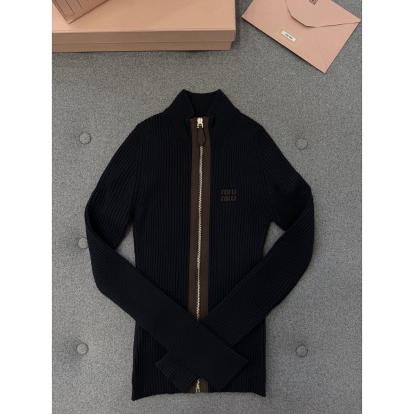 미우미우 골지니트 캐시미어 혼방 집업 가디건 87% 캐시미어, 12% 폴리아미어, 스판 1% 혼방으로 제작 상체가 답답하지 않고 여성스러운 곡선을 완벽하게 표현하며 심플하면서도 디테일이 돋보이는 브라운 스웨이드백 지퍼와 양가죽 자수 로고