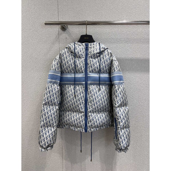 Dior 25 가을 겨울 새로운 레터링 올드 자카드 후드 패딩 코트 옅은 블루 톤의 올드 자카드 전폭이 가득하며 클래식한 CD 로고가 절제된 인지도를 가지고 있음 블루와 화이트 스트라이프가 어깨 등을 관통하며 등판의 CHRISTIAN DIOR 레터링이 포인트 후드 + 스트링 조임 + 커프스 소매 디자인은 보온성과 깔끔한 실루엣을 잘 잡아주고 부드러운 패딩의 질감은 비대해 보이지 않아 마치 구름을 몸에 입은 것 같음