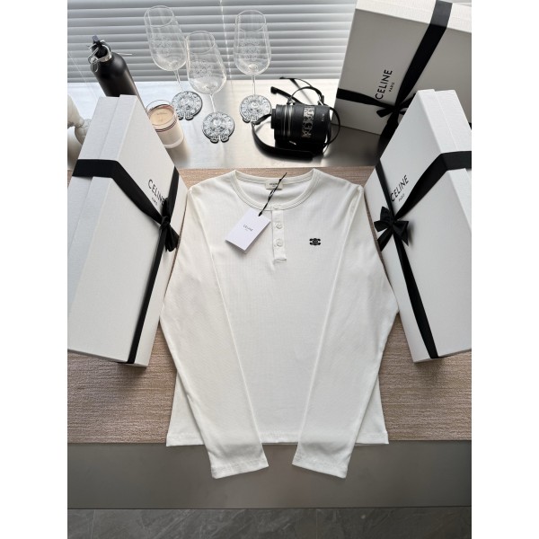 Celine 25FW 개선문 자수 긴팔 티셔츠 ZP 5900 구매 분해 제작 100% 순면 소재 맞춤, 오픈 몰드 맞춤 진주 조개 단추 맞춤, 가슴 장식용 박음질 개선문 자수 로고 시그니처 스트라이프 골지 소매 목선 맞춤 초밀도로 부분 짜임, 소매 밑단 이중 잠금 라인 진정한 1:1 복원