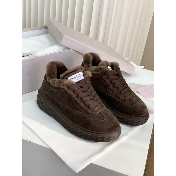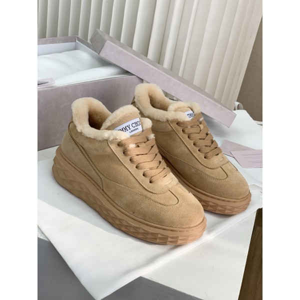 JimmyChoo, 채널 정품 최고급, 공식 웹사이트 동시 2025 매장의 최신 윈도우, 패션 통굽 리얼 퍼 스니커즈 겉감 맞춤 고광택 반폴라 안감 깔개 맞춤 램스울 보송보송 고무몰드 충격완화 밑창, 통굽 4cm