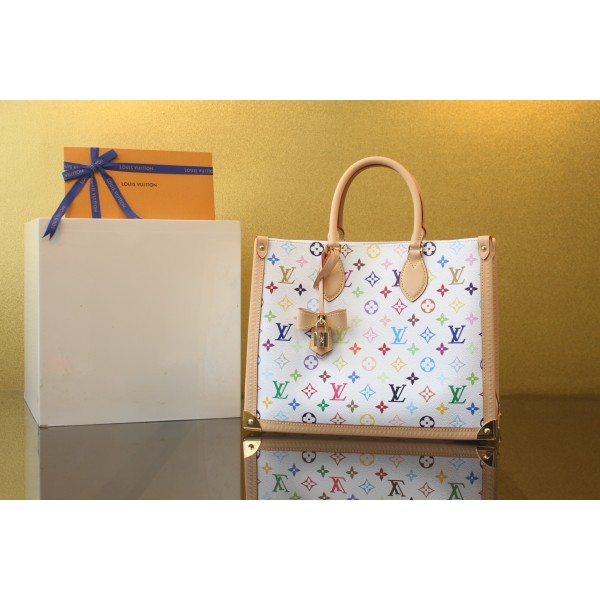 루이비통 X TM 온더고 MM 모델번호 M13079 무라카미 타카시 Onthego 모노그램 멀티컬러 코팅 캔버스와 소가죽으로 제작 퀄리티를 충분히 설명하는 디테일로 핏, 가죽, 라인, 오일링, 핸들 곡선을 보고 마지막으로 철물의 밝기 사이즈 35x27cm