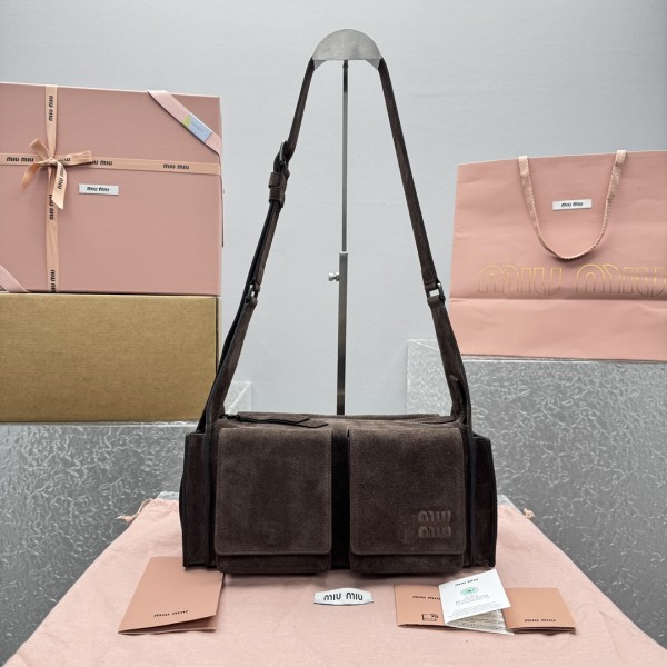 미우미우 26ss 모닝쇼 투포켓 메신저백 캐주얼하고 나른한 가방스타일로 우아하고 다른 면모를 드러내며 더욱 강렬한 라이프 스타일을 선사하는 스웨이드 메신저백 부드러운 터치감과 넉넉한 용량 어깨끈을 조절하여 숄더와 크로스가 가능 사이즈 : 밑면길이 33×밑면폭 9(포켓포함 15)×높이 17cm