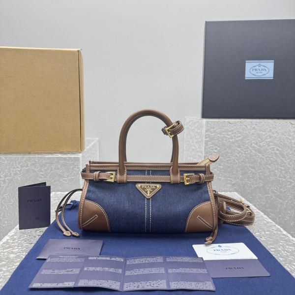 프라다 보니백 데님 데님 가죽 클러치 스타일은 어디에나 잘 어울리며 모던하고 스타일리시한 기하학적 디자인을 사용하여 다양한 요소를 절묘하게 융합하여 트렌디한 미적 스타일을 보여줌 소가죽 손잡이 및 베젤에 빈티지한 필터가 들어가 있음 사이즈 : 밑창길이 23.5x너비 9x높이 12cm