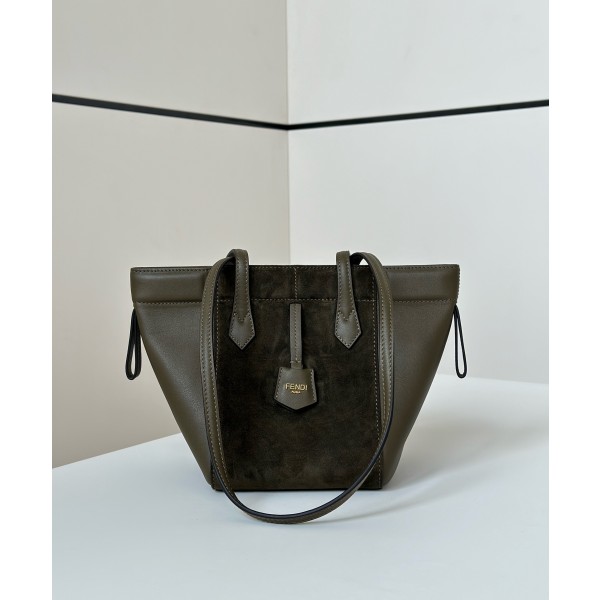 펜디의 새로운 폴딩백 오리가미 미니 스웨이드 스크럽과 송아지 가죽을 이어붙여 종이접기에서 영감을 받아 가방 모양을 마음대로 바꿀 수 있으며 숨겨진 마그네틱 버클은 물건의 안전성과 아름다움을 보장하며 오픈은 토트 스타일로 접으면 버킷백으로 아이디어와 실용성이 조화를 이룸 사이즈 15x15x19cm