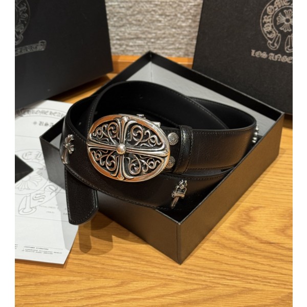 크롬하츠 십자가 스터드 벨트 블랙 리치 무늬 소가죽으로 섬세하고 내구성이 좋으며 실버 메탈 스터드는 고딕 교회 창문 장식에서 영감을 받은 132개의 십자화 리벳으로 디테일이 세련되고 시인성이 높으며 폭이 적당하여 데일리룩이나 스트리트룩에도 잘 어울림 브랜드의 아이코닉한 디자인으로 트렌드세터들의 필수 아이템 너비: 3.8cm