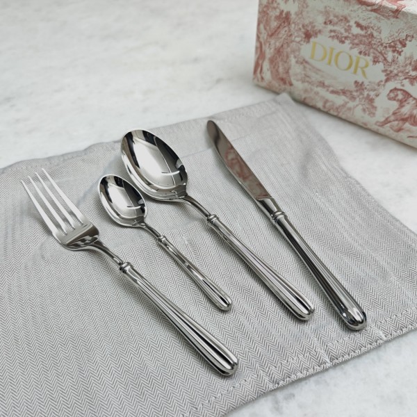 디올 커트러리 실버 럭셔리와 예술의 만남 도금된 스테인리스 스틸 소재의 포크 스푼 광택이 고급스러움과 럭셔리를 표현해줌 각 식기들은 마치 정성껏 조각된 예술품처럼 매끄러운 선과 정교한 공예가 돋보임 고품질 삶에 대한 추구와 아름다움에 대한 집착을 대표함