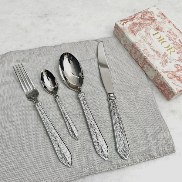 디올 커트러리 실버 럭셔리와 예술의 만남 도금된 스테인리스 스틸 소재의 포크 스푼 광택이 고급스러움과 럭셔리를 표현해줌 각 식기들은 마치 정성껏 조각된 예술품처럼 매끄러운 선과 정교한 공예가 돋보임 고품질 삶에 대한 추구와 아름다움에 대한 집착을 대표함
