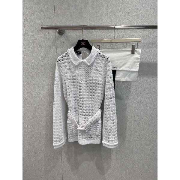 샤넬 26C 고급 수제 공방 시리즈 펀칭 니트 탑 인형 넥은 생동감 있고 소녀스러운 느낌을 주며 펀칭 코바늘 공예가 어우러져 우아함 허리와 같은 소재의 벨트로 아름다운 허리 라인을 잡아주며 백사 같은 결이 빛과 그림자 아래 아련한 질감을 발산함 각각의 바늘은 고정 공방의 장인 정신으로 타의 클래식한 우아함을 일상의 낭만 속에 담고 있음
