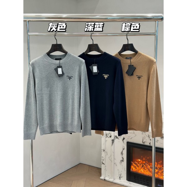 프라다 로고 자수 울 니트 저지 100% 울, 노멀핏 골지 라운드넥 골지 니트 소매와 밑단 앞판 브랜드 레터링 자수 로고