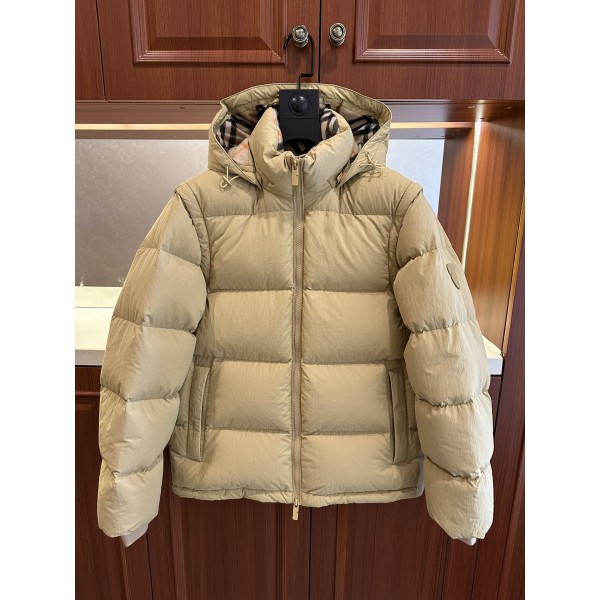 버버리 2025 가을 겨울 공식 최신 넥타이 후드 패딩 점퍼 모자 탈부착가능, 소매 탈부착 가능 수입 나일론 방풍 방수원단, 안감 폴리에스터 안감 후드 안감 및 넥 부분의 클래식한 스코틀랜드 체크무늬 울 원단 소매 브랜드 로고 자수 로고가 브랜드 특징을 나타내며 높은 여밈 맞춤 더블 지퍼 디자인 안감 충전이 매우 도톰하며 국가 표준 90% 화이트 구스 다운 + 10% 모판 가볍고 보온성이 있으며 3가지 라벨이 완비되어 있으며 오리지널 금속 부자재
