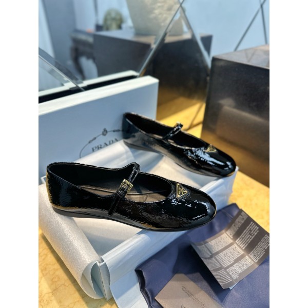 프라다 NAPLANK 페이던트 메리제인 플랫슈즈 원뿔 모양의 실루엣과 나플락 에나멜 가죽으로 정교함을 더해 우아하고 여성스러운 느낌을 줌 라운드 쉐입에 고무창과 에나멜 삼각형 메탈 로고 장식이 클래식한 라인과 세련된 디테일이 돋보이는 제품