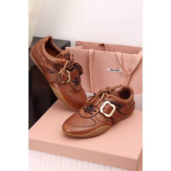 미우미우 버클 레더 스니커즈 구제 소가죽 소재의 앞면에 투톤 스트랩과 메탈 스트랩의 두 가지 고정 방식이 캐주얼함과 조절성을 더하였으며 구제된 메탈 버클이 빈티지한 멋을 잘 조화시켜 줌