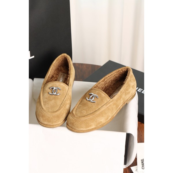 샤넬 멜라드 로퍼 짙은 살구색 뉴징에 실버 더블 C LOGO를 매치하여 볼드한 파이핑 디자인으로 심플하고 러블리하게 잘 어울리며 뽀글이 소재가 정말 편하고 따뜻함