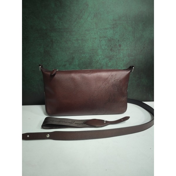 BERLUTI Toujours Soft Pouch Scritto 레더 클러치백 이 클러치백은 베개처럼 부드러운 새로운 Softy 가죽으로 제작 손목밴드를 착용하여 손목 사이에 끼우거나 가볍게 손에 쥘 수 있음 묵직해 보이지 않는 실루엣과 적당한 사이즈 외부 특징: 추가 D링 내부 특징: 플랫 포켓 1개 생산: Toujours Soft 탈부착 스크리토 패턴 자카드 손잡이 끈 하나 사이즈 : 높이 18cm - 길이 33cm - 너비 6cm