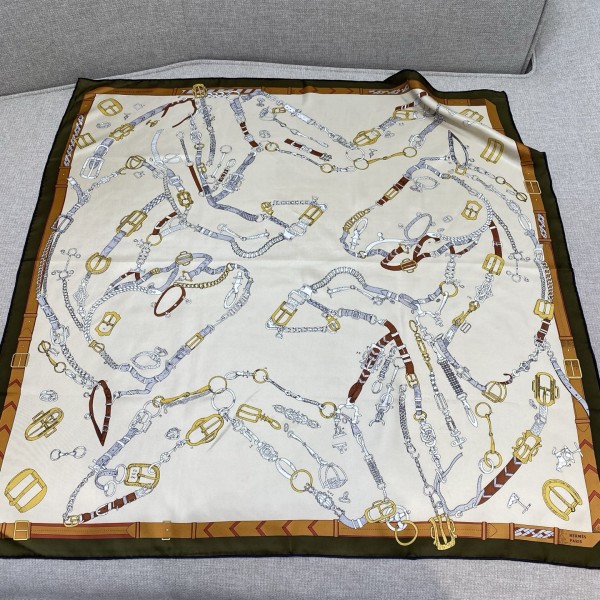 에르메스 달리는 말 90 스카프 두 마리의 준마가 서로 마주 보고 있음 얼핏 보면 대칭적인 윤곽이 연필로만 그려져 있는 것처럼 보임 옥타브 마르살(Octave Marsal)의 정교한 선은 사실 일련의 버클, 체인, 등자 및 끈으로 구성되어 있으며 에밀 에르메스(EmileHermes) 소장 목록 도책에서 영감을 받았음 소재: 100% 실크 size: 90x90cm
