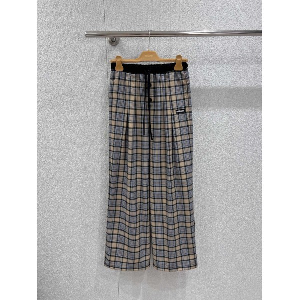 미우미우 26 이른 봄 버튼 체크 캐주얼 팬츠 하이웨이스트 원단을 엄선하여 연한 카키 베이스와 네이비 체크무늬를 믹스하여 섬세하고 떨어지는 결이 돋보이며 허리는 스트링 + 버튼 이중 디자인으로 몸매에 맞게 디테일을 살리면서 깔끔한 와이드 컷팅이 허리 사타구니에서 자연스럽게 흘러내려 다리라인을 약화시킴과 동시에 느슨한 분위기를 연출함 팬츠 옆의 브랜드 로고가 절제된 포인트