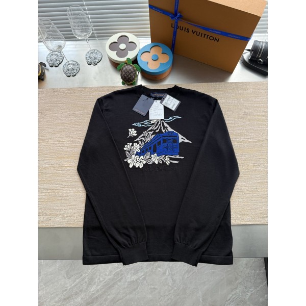 Louis Vuitton 25FW 자수 레터링 라운드니트 ZP 10770 구매 분해 제작 맞춤직 100% 블랙 면 니트 원단 이태리 앞판 장식 LV 자수 레터링 자카드 원단과 어우러지도록 자카드 맞춤직 시그니처 골지 네크라인 소매 밑단, 초밀도로 부분 짜임 진정한 1:1 복원