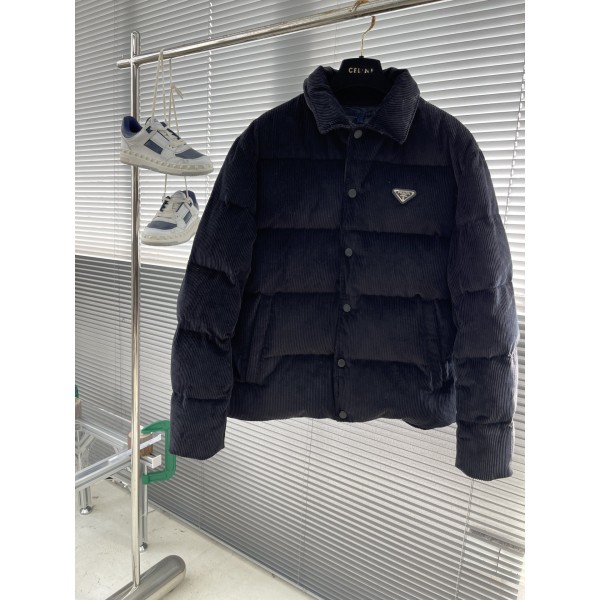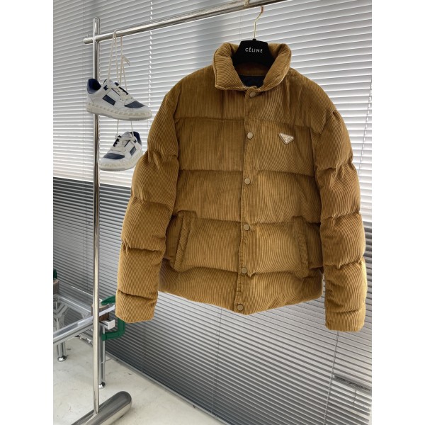 프라다 코듀로이 숄카라 야상패딩 커스텀 코듀로이 컴포트 원단, 터틀넥 디자인 클래식한 가슴 삼각 메탈 로고로 포인트 오픈 메탈 커스텀 버튼이 여닫힘 밑단 스판 밴딩 디자인 48사이즈 기장68 가슴둘레124 어깨너비52