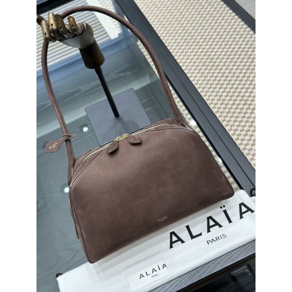 알라이아 Le Bouledogue 미디엄 스웨이드 숄더백 수입 누벅 부드러운 스웨이드 송아지 가죽으로 제작 가는 관모양의 손잡이&장식 매듭&메탈 버클이 장식 대용량을 만족시키면서 여성스러움을 표현하였으며 미니멀한 디자인은 손잡이의 대각선 디자인으로 인체공학적 Size:32x17x15cm