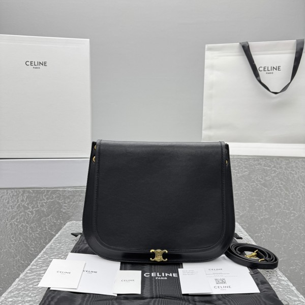 셀린느 소프트 트리오페 베사체 무광 블랙 가죽으로 깔끔한 스퀘어 바디를 완성하였으며 시그니처 골드 톤의 개선 버클로 포인트 차가운 메탈 질감과 부드러운 가죽이 만나 독특한 프렌치 톤을 연출함 플랩 디자인이 심플하고 고급스러우며 어깨끈을 조절하여 숄더와 크로스로 매치할 수 있으며 터프한 실루엣에 적당한 이완감을 느낄 수 있어 직장 통근시 깔끔한 스타일링과 일상적인 아웃도어 캐주얼 코디 모두 클래식한 스타일 사이즈 : 바닥길이32 x 높이26 x 바닥폭2cm