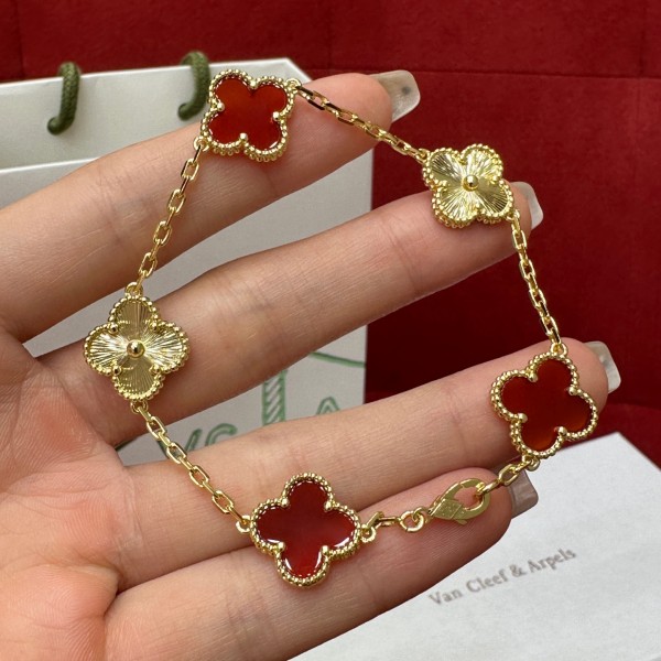 VCA 홀로그램 골드 토파즈 오겹 팔찌 홀로그램 골드 네잎클로버와 토파즈 네잎클로버가 조화를 이룸 근육에 새겨진 홀로그램 골드 클로버는 매혹적인 반짝임을 선사하며 레드 토파즈는 고귀하고 차가움 너만의 행운과 우아함을 완벽하게 연출
