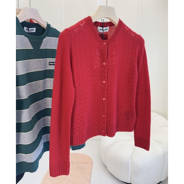 미우미우 2026 새해 한정 레드 가오리핏 니트 가디건 고급 정홍 배색에 미세 부채꼴 펀칭 코바늘 디테일 100% 캐시미어 실, 정염 새해 정홍색 가득 새해 분위기 수입 기계는 무거운 부채꼴 펀칭 코바지를 제작 공예는 복잡하고 중공업적이며 직면은 평평하고 깨끗함 칼라, 소매와 밑단은 미세 골지 장식 등판은 클래식 로고 레터링 로고로 격식을 강조함