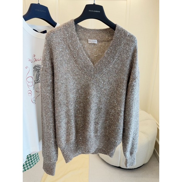 Brunello Cucinelli 2026 이른 봄 신상 스팽글 브이넥 니트 맞춤 실, 스팽글 포인트가 은은하게 반짝임 브이넥+숄더 디자인으로 박시한 실루엣으로 편안하면서도 스타일리시하고 다크 카키 컬러로 통근이나 파티에도 무난하게 소화하실 수 있으며 스커트나 와이드 팬츠에 매치하시면 정말 멋스러움
