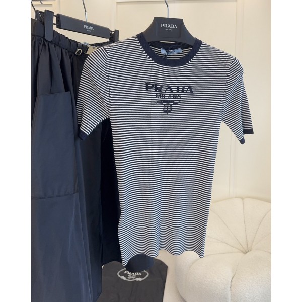 Prada 2026 봄여름 신상 스트라이프 반팔 티셔츠 파란색과 흰색 스트라이프 + 가슴 브랜드 로고 니트 원단이 신축성이 좋아 몸에 붙어 편하고 슬림핏으로 몸매를 드러냄 스트라이프 요소가 클래식하게 매치되어 데일리 출퇴근이나 캐주얼에도 무난하게 소화가능 단품으로 입어도 이너로도 OK