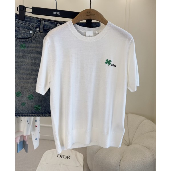 Dior 2026 봄여름 신상 클로버 자수 니트 반팔 100% 극세사 울 실, Jonathan Anderson 디자인 화이트 메인 컬러 + 가슴 그린 클로버 자수 행운의 상징, Dior 로고, 심플하면서도 인식감 있는 아이템 라운드넥+루즈핏으로 데일리 통근, 캐주얼 모두 소화가능 단품이나 이너 모두 스타일리쉬한 레이어드룩