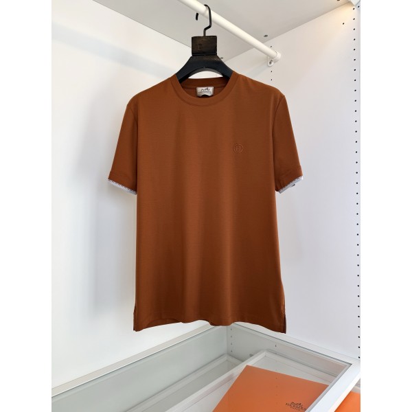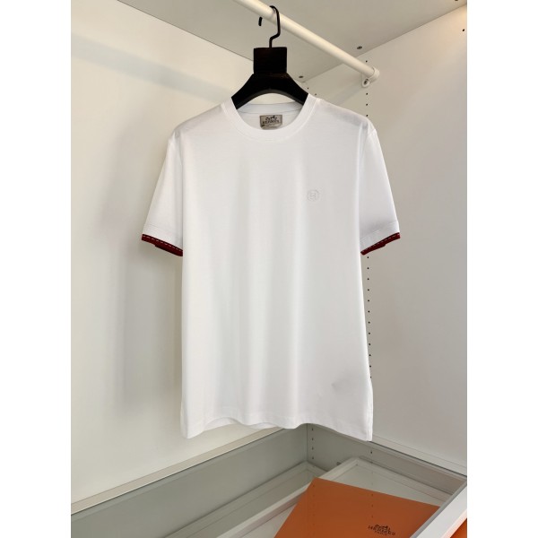 에르메스 2026 봄여름 셀리에르 디테일 라운드넥 반팔티셔츠 클래식한 베이직 이중 프릴 소매 컬러가 들어간 셀리에르 디테일 포인트 디자인 풍부하고 다층적인 디테일이 어우러진 커팅 네크라인이 목 윗부분에 살짝 밀착되어 스타일리시하고 질감이 좋으며 원단은 커팅 전 염색 전 5회 세탁 기준 수축률을 2% 이내로 엄격하게 관리 약간 느슨한 커팅으로 옷차림에 대한 통근자들의 심플한 니즈를 만족시키며 겉감은 하이 실켓 면으로 되어 있음 표면이 광택이 있고 편안하고 매끄러우며 원단이 가공되어 있음