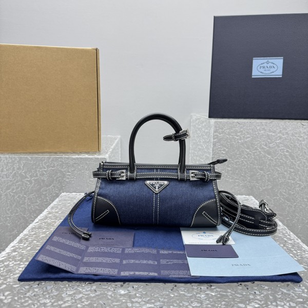프라다 보니백 블랙데님 새로운 데님 클러치 전통을 깨고 정말 너무 귀여움 데님 가죽 클러치 스타일은 어디에나 잘 어울리며 기하학적 디자인을 사용하여 다양한 요소를 절묘하게 융합하여 트렌디한 미적 스타일을 보여줌 소가죽 손잡이 및 베젤에 빈티지한 필터가 들어가 있음 사이즈: 23.5x9x12cm
