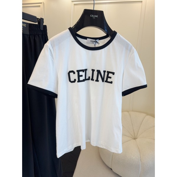 CELINE 2026 화이트 면 입체 레터링 티셔츠 블랙 레터링 + 컬러가 들어간 소매 넥라인 심플하면서도 인식감 있는 정면에 CELINE 글자가 포인트 루즈핏으로 편안한 착용감을 선사하며 데일리 캐주얼이나 스포티한 룩에도 무난하게 연출가능