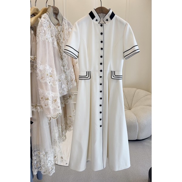 Dior 2026 신상 마린룩 원피스 맞춤 울 혼방, 질감 가득, 스탠드 칼라 + 풀오픈 디자인 입고 벗기 편하고 넥과 소매 끈 연결, 디테일 만점 카라에 두 마리의 정교한 작은 꿀벌 자수, 브랜드 느낌 가득 큰 스커트 자수 허리 조임 슬림, 우아함