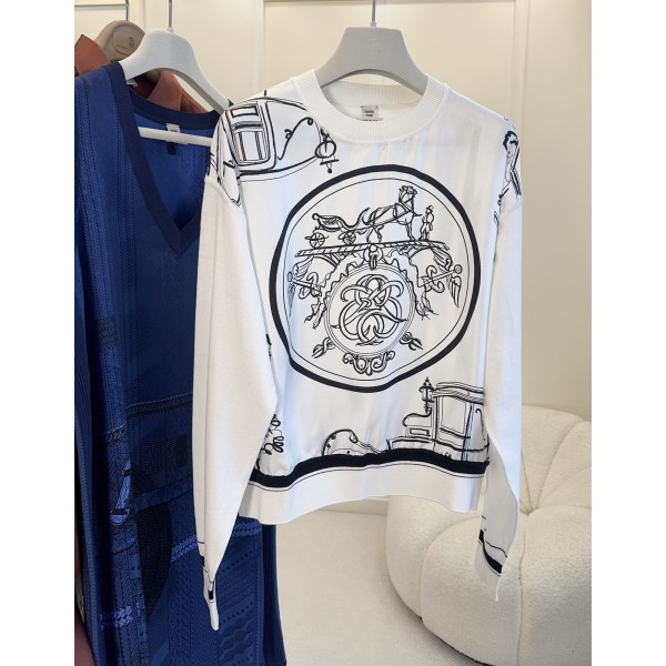 Hermes 2026 봄과 여름의 새로운 니트 패치 프린팅 긴팔 화이트 위즈후 블랙 라인으로 복잡한 패턴을 그려내고 중앙 원형 배지에 천사, 악기 등의 요소가 어우러져 예술적인 느낌이 가득하 니트 원단으로 부드럽고 편안하며 루즈핏 + 라운드넥 디자인으로 단품이나 이너 모두 OK 소장가치와 인지도가 높으며 트렌디하고 세련됨
