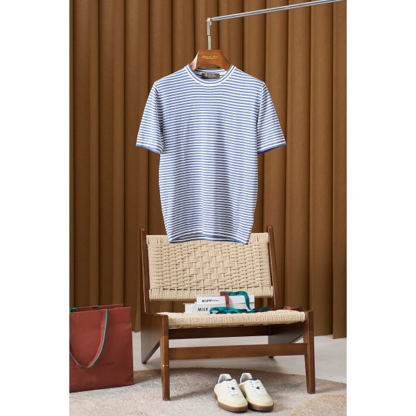 LP, 블루, 화이트 스트라이프 반팔 티셔츠 무더운 여름 남성 옷장에서 고품격 티셔츠 원단 면은 린넨 100% 소재로 통기성과 흡습성이 뛰어나 더운 날씨에도 피부를 보송보송하고 편안하게 유지시켜 줌 정교한 커팅과 바느질 기술로 티셔츠의 모든 디테일이 완벽함을 보장 네크라인, 소매, 밑단의 가공이 매우 정교하며 선이 매끄럽고 쉽게 변형되지 않음