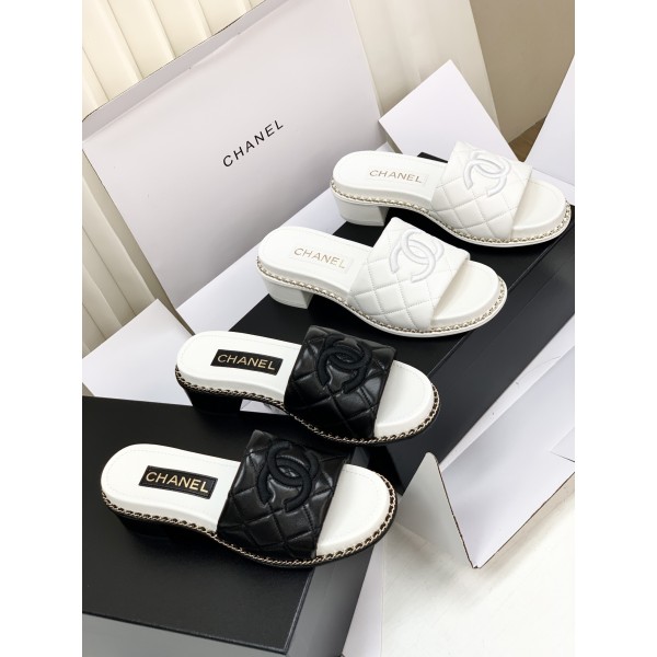 샤넬 정품급 천장공예, 공식 홈페이지 동시 봄여름 신상, 바캉스 통굽 양가죽 체인 슬리퍼 겉감 수입 혼종 양가죽 마름모 무늬 전기 쇼 공법 순동 체인 제작, 안감 징검다리 양가죽 부드럽고 섬세하며 이태리 리얼 가죽 밑창 굽 5cm