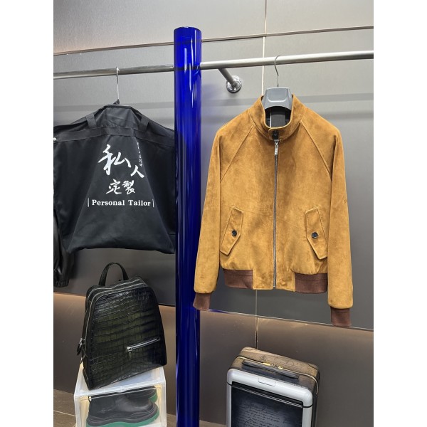 프라다 부드러운 스웨이드 가죽 파일럿 재킷 클래식한 실루엣을 연출하고 빈티지한 매력을 선사함 가운데 지퍼 여밈과 차이나카라 디자인이 심플한 스타일로 래글런 소매와 니트 소매가 편안함을 더해줌 라이닝 포함: 흑색 큐브라 핏: 일반 핏