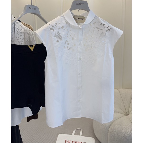 Valentino 2026 신상 펀칭 자수 민소매 블라우스 크롭 면+세련된 자수로 디테일이 가득 가슴팍에 펀칭된 레이스가 레이어드감을 주며 아기자기한 인형넥으로 일상적인 통근, 데이트에도 무난하게 소화 스커트나 와이드 팬츠에도 잘 어울리며 고급스럽게 매치가능