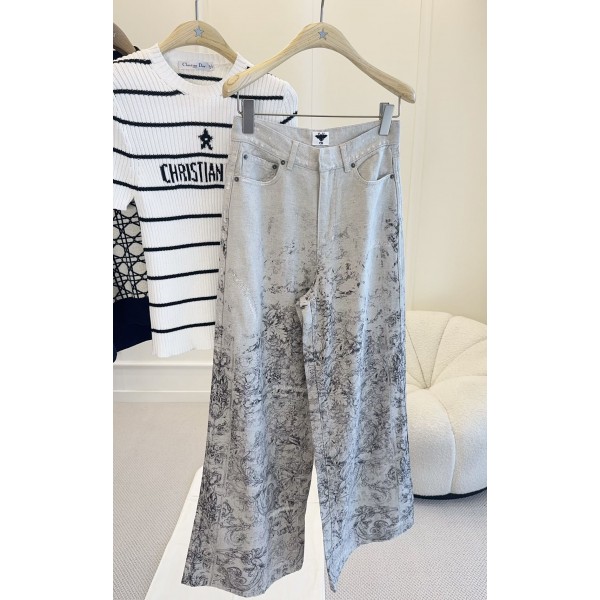 Dior 2026 신상 컷팅 프린트 와이드 팬츠 면과 린넨 혼방으로 편안하고 하이웨스트 박시한 디자인 떨어지는 원단으로 다리가 길어 보이는 효과 중공업 디스트로이드 자수, 매우 중공업, 수묵 번짐 프린트 포지셔닝 프린트, 아트적인 느낌 가득 우아하면서도 고급스러움, 통근 캐주얼에도 무난하게 소화 가능
