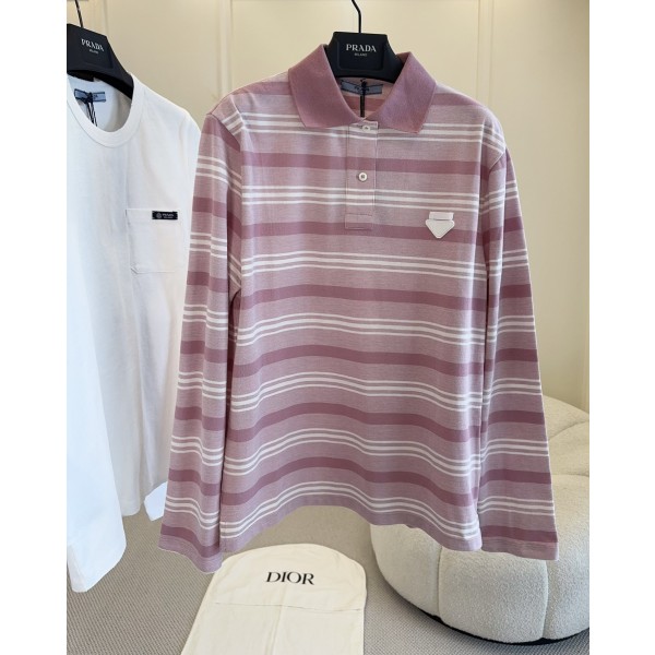 Prada 2026 새로운 핑크 스트라이프 긴팔 폴로 오리지널 정염 원단, 핑크-화이트 배색 디자인 부드러운 면 원단으로 착용감이 편안하고 통기성이 좋음 클래식한 터틀넥 + 루즈핏으로 빈티지하고 캐주얼하며 가슴 작은 포켓 디테일이 넘침 단품으로 입거나 겹쳐 입어도 돋보이는 아이템
