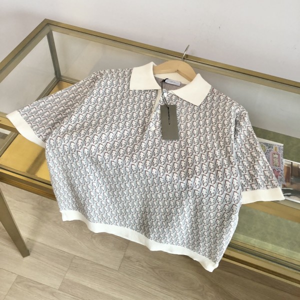 Dior Oblique 프린트 폴로셔츠 화이트 블루 브라운 코튼 자카드 클래식한 Oblique 프린트로 장식된 니트 폴로 셔츠 코튼 자카드 원단으로 정교하게 제작되었으며 스트레이트 컷팅으로 단추 여밈과 골지 디테일이 세련되었음 전체 장식에 Oblique 프린트로 Dior 로고가 새겨진 진주 조개 단추 시보리 네크라인과 밑단, 소매 끝단, 면 100%