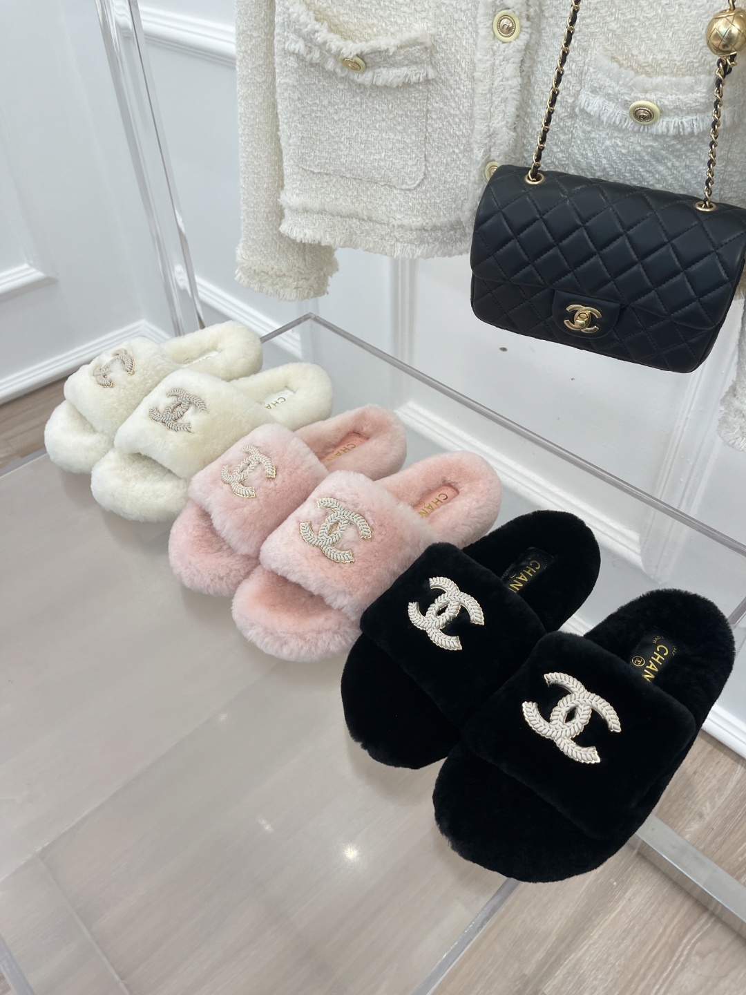 CHANE* 쁘띠향기 봄여름신상더블C어부짚업슬리퍼 '선착용' 시리즈 걸어가는 양털이 뽀송뽀송해서 너무 귀엽고 편해요! 깔끔하고 세련된 스타일 羊毛양털신발에 C빅로고를 박아 눈과 귀를 즐겁게 하는 느낌 윗발에 미가 터졌어요 겉면/발판:호주 수입 순양모 대저: 고무 대저 내마모성 미끄럼 방지
