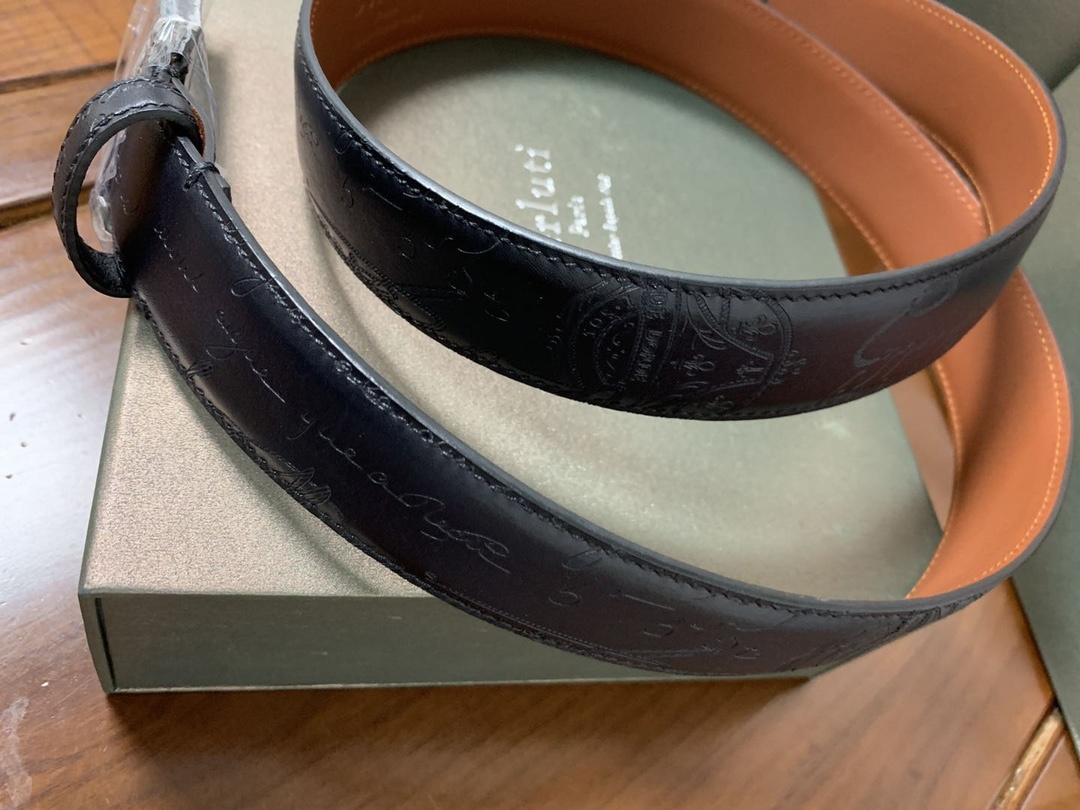 Berluti 영구시리즈 클래식벨트-35mm 벨트에 달린 다양한 송아지 가죽 소재의 가죽 스트랩은 어디에나 사용 가능합니다. 이탈리아 이름 Versatile에 충실한 이 가죽 스트랩은 당신의 스타일을 한순간에 바꿔줍니다. 정면의 매끄러운 베네지아 송아지 가죽은 우아하고, 뒷면의 베네지아 스크리토 송아지 가죽은 캐주얼하면서도 반항적이어서 원하는 스타일을 완성시켜 줍니다