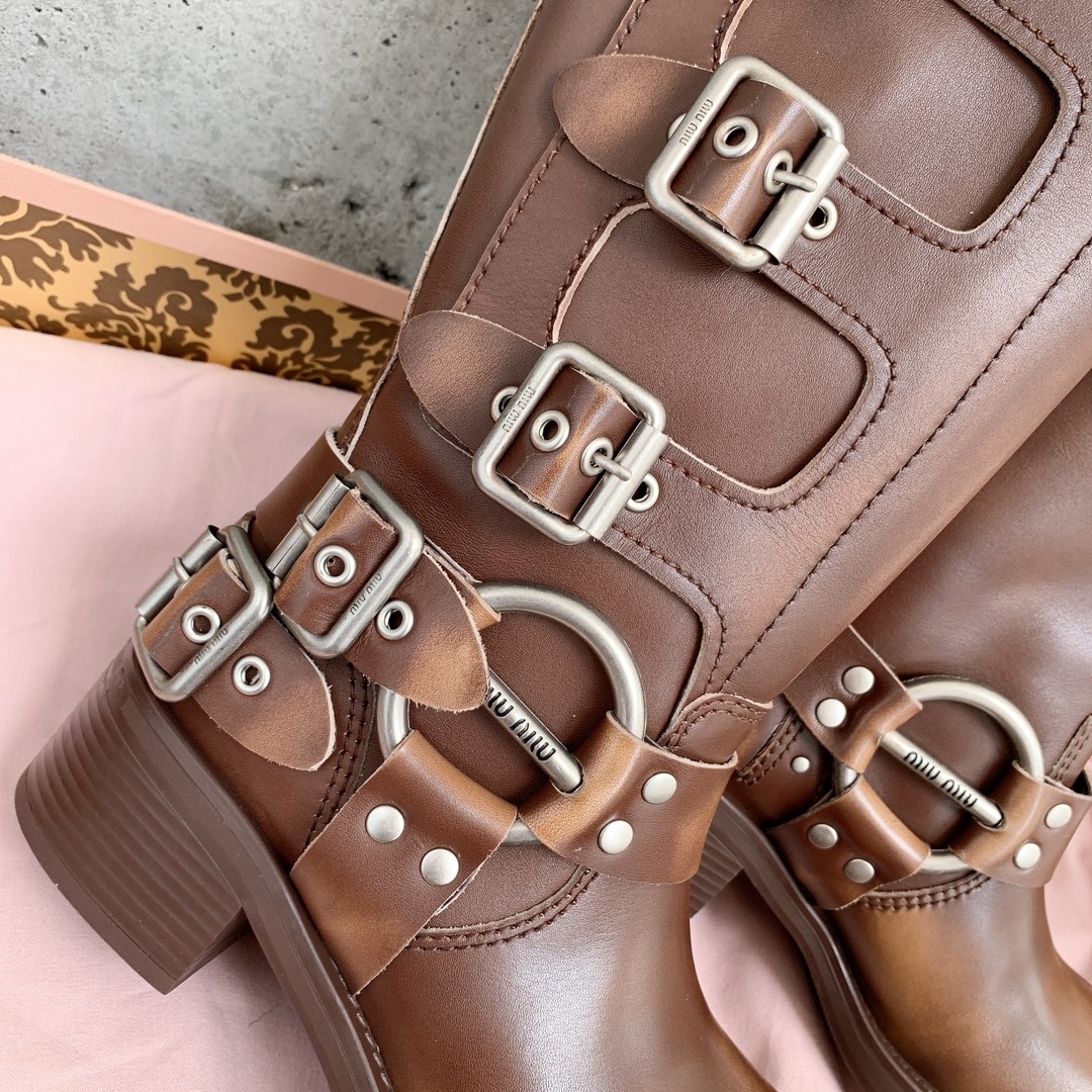 mi* mi* 2022 가을 겨울 런웨이 라이더 부츠 글로벌 한정판 오리지널 1:1 맞춤 수입 투톤 송아지 원단 양가죽 안감, 대판 구제 철물 버클, 프라이빗 몰드 TPU 밑창, 4.5cm 굽 높이