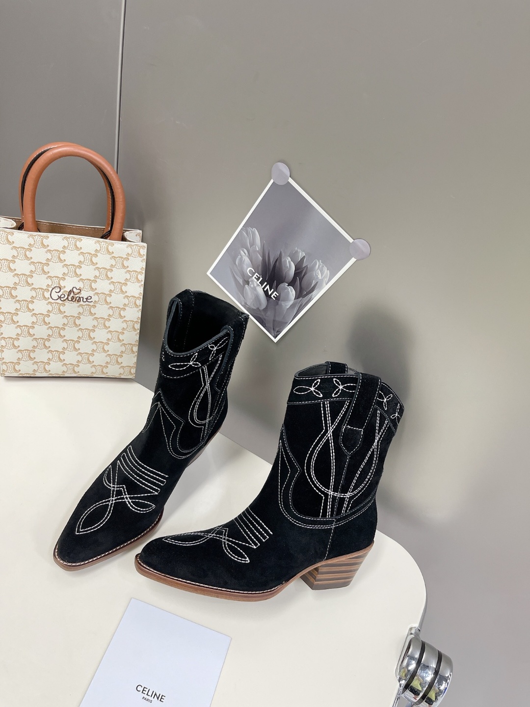 셀린느 매장의 최신 웨스턴 데님 스타일 라이더 앵클부츠 런웨이 스타일 블로거와 같은 초가을 파워업 아이템 중공업 조각 공예 개선문 로고 포인트 매우 고급스럽고 분위기 있는 사계절 착용이 가능한 앵클부츠 신발표면: 오리지널 맞춤 고사광 소 힘줄 안감: 징검다리 실크 소가죽 안감, 대창: 이태리 수입 두꺼운 가죽 대창 굽: 5cm