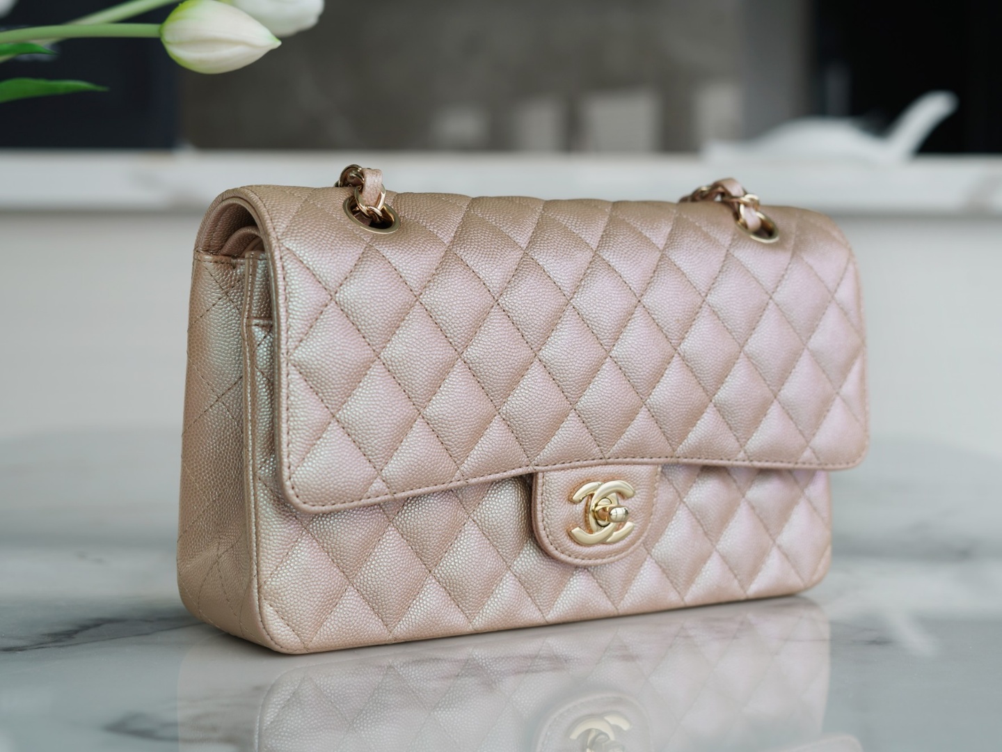 CF 오리지널 캐비어 미디엄 사이즈의 환채 샴페인 골드입니다. A01112 프랑스 오리지널 캐비어 알갱이의 촉감과 색감은 일품 11년 순수 수작업 주력 클래식, 전면 플랩과 바디라인의 완벽한 궁합 바느질 마름모꼴이 딱 1/2입니다. 정교하게 다듬어 정품을 선사합니다! SIZE:25cm