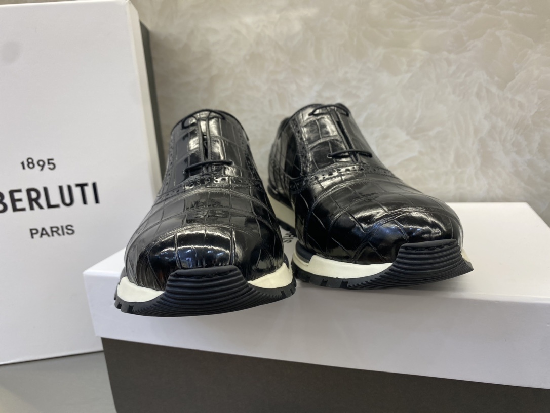 Berluti Fast Track Torino 악어 가죽 운동화입니다 패스트트랙 슈즈 런칭으로 벨루티는 러닝화 패션을 품으며 브랜드 역사의 신기원을 열었습니다. 빅 가죽 스트랩, 아일릿과 장식적인 패턴의 끝부분 2개의 스트랩 슈즈 심플하고 운동에 도움을 주는 저항선 노치가 살짝 바깥쪽으로 펼쳐진 패턴과 기하학적인 패턴의 미끄럼 방지 절개창입니다.