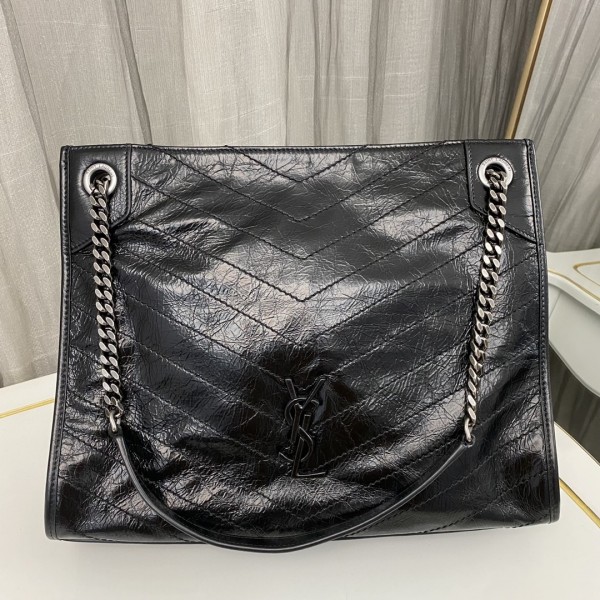 YSL 니키 쇼핑백 오일왁스 주름잡는 소가죽에 랩핑로고, 시보리 라이너 마그네틱 잠금장치, 지퍼포켓, 오픈포켓 하나 자중 초경량 대용량, 출근통학 모두 좋아요 모델번호:577999【블랙】 사이즈 : 33*27*11.5cm